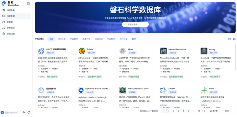 科学数据模块为科研人员提供一站式数据检索与获取服务,汇聚全球权威科学数据库,涵盖材料科学、生命科学、流体力学、地球科学、空间科学、神经科学、数学等各学科领域。